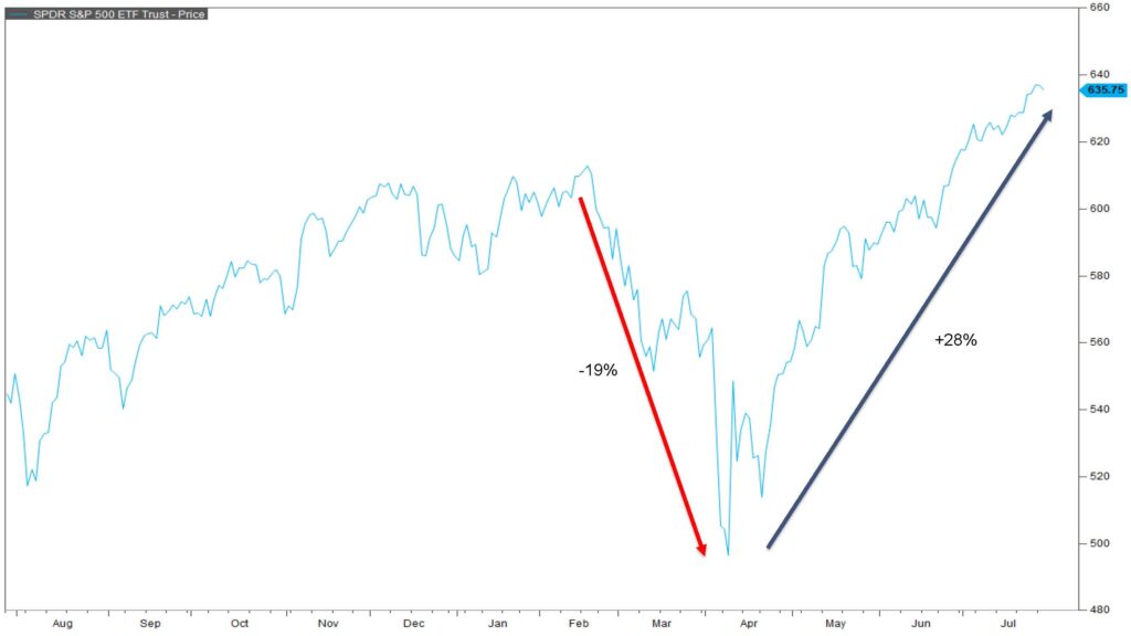 Fortunes in the market have completely reversed this summer relative to the spring. At the beginning of the year, the market peaked in February and fell significantly throughout the month of April. Since that April 8th bottom, however, the market is up nearly 28%.