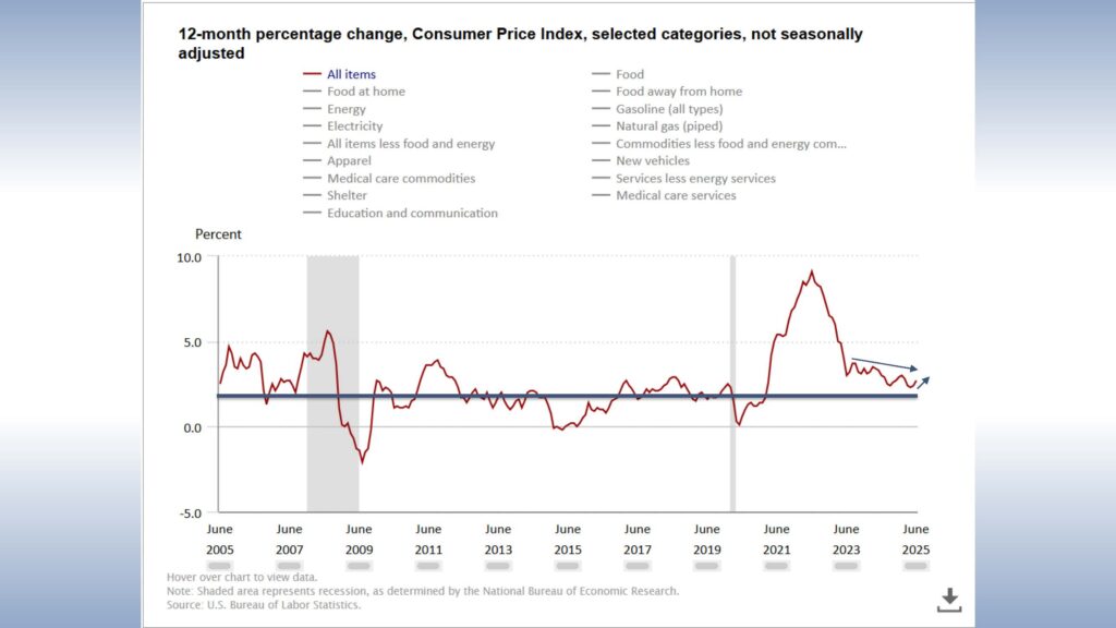 - U.S. Bureau of Labor Statistics. Graphics for Economic News Releases. “12-month percentage change, Consumer Price Index, selected categories”. Updated July 15, 2025. Retrieved from https://www.bls.gov/cpi/