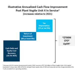 With both nuclear reactors online, Southern Company is expected to recover debt and equity costs of 10.5% return on equity (rate increases coming). The plant is expected to have a 60 year book life and a 15-year tax depreciation shield that should increase cash flows from operations (CFO) by around $700 million per year, according to the latest results. The impact on cash flows has been illustrated in the latest earnings report: